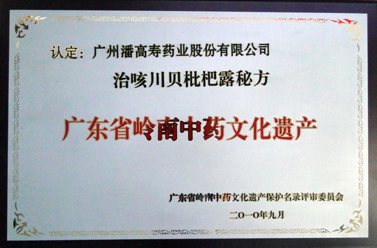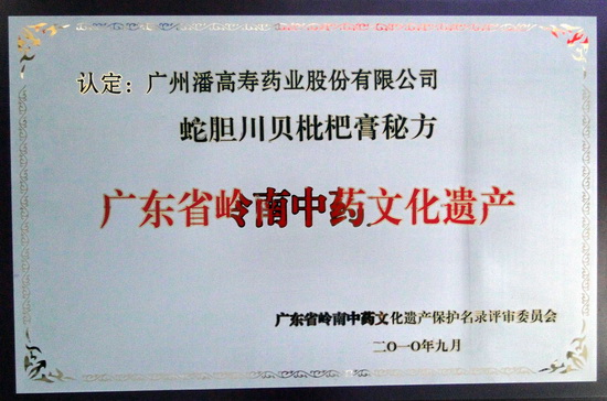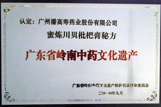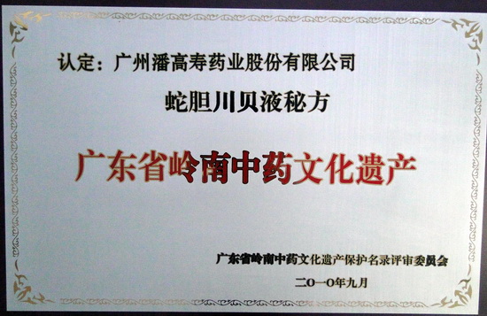 潘高壽“蛇膽川貝枇杷膏”、“蜜煉川貝枇杷膏”、“蛇膽川貝液”、“治咳川貝枇杷露”四大產(chǎn)品于2010年9月27日由廣東省醫(yī)藥行業(yè)協(xié)會(huì)正式授匾,成為入選“廣東省嶺南中藥文化遺產(chǎn)” 品種最多的醫(yī)藥企業(yè)之一。再一次印證我司深厚的中藥文化底蘊(yùn),為我司以后四大產(chǎn)品以及其他產(chǎn)品的戰(zhàn)略發(fā)展奠定基礎(chǔ);同時(shí)吹響中藥強(qiáng)省集結(jié)號(hào),保護(hù)中醫(yī)藥文化,弘揚(yáng)中醫(yī)藥文化精髓。