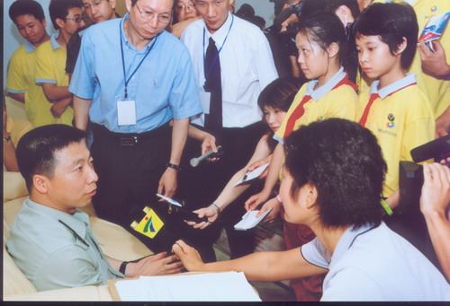 “你上太空時,害怕嗎?”?!澳氵€會再‘飛天’嗎?”在高技術(863)產業中心貴賓室里同學們七嘴八舌?!坝悬c興奮,發射‘神五’當天清早,胡錦濤主席來到指揮中心為我送行,眼里噙者熱淚,我感受到他對航天人的關切與厚望,更堅定我完成所肩負實現中華民族飛天夢的 重任的信心”。楊利偉和顏悅色地一一回答了大家的提問。他還透露,中國神舟六號下半年將上太空。為此,參加“神六”號飛船載人航天集訓的航天員近期進行了微重力生理適應測試。而在連續五晝夜大強度的測試過程中,克服了訓練給人體帶來頭脹、鼻塞等不適,經受住了從心理到生理全方位的考驗……。