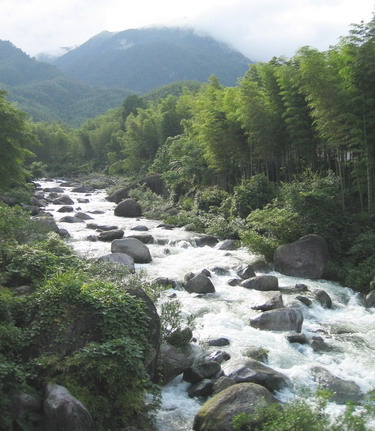 傍晚時分,我們開始進入山區,只見路兩邊青竹相迎,一條碧綠的河相伴而行,河里隱現形狀各異的鵝卵石,稀落的村莊掩映在綠茵之中,好一幅美麗的山水圖畫啊。經過一個多小時的顛簸,總算到達貓兒山山腳的一個小村莊——高寨。只見三兩個獨行俠或老師帶領著幾個來采標本的學生。我們安頓后,就急不及待地前往十里大峽谷。峽谷風景果然秀麗非常。那里盡是怪石嶙峋,山泉在其中穿梭,沖出個個大小瀑布。瀑布潭相接,形狀各異,潭水碧如玉,感受在洗滌身心。再看兩岸翠竹遙相映,更聞鳥兒、昆蟲聲,真可謂是天然的SPA天堂,我們醉了。