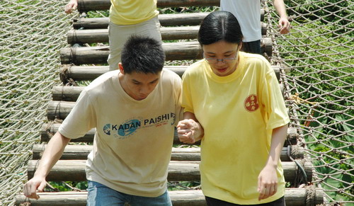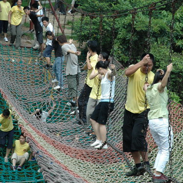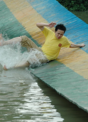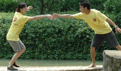 看!走“天梯”,十指緊扣,管他(她)是否意中人(圖1),只要一起度過(guò)就行(圖2);瞧!過(guò)浮橋,認(rèn)準(zhǔn)目標(biāo),沖啊!可惜,“馬失前蹄”。瞧!“天橋”,左手伸來(lái)右手接(圖3)。我為人人,人人為我……