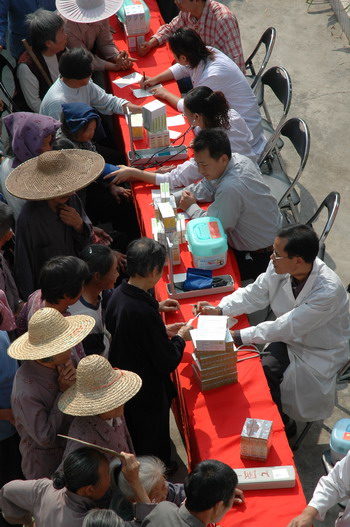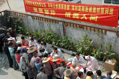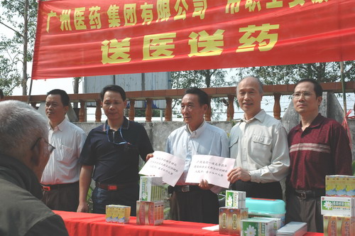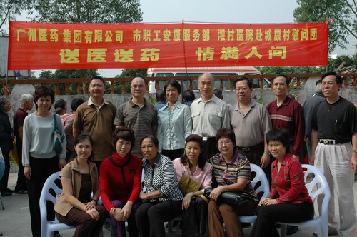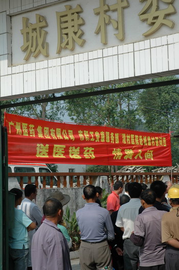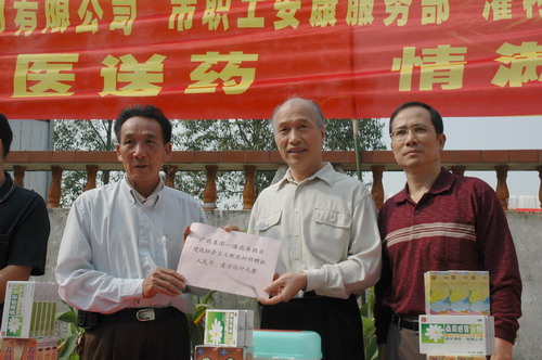 兩邊紫荊花伴,一條平坦大道延伸至從化城郊鎮(zhèn)城康村前,15日上午,該村委會的小院再度熱鬧起來。廣藥集團下屬潘高壽、市醫(yī)藥公司、市藥材公司以及灌村醫(yī)院、從化公路局等單位組成的慰問團在此向村民送醫(yī)贈藥。潘高壽和從化市公路局送上3萬元修路費。同時,潘高壽還送去治咳嗽、治感冒等九個品種藥物一批。灌村醫(yī)院、市第一工人療養(yǎng)院醫(yī)生為村民義診。
