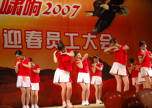 紅彤彤,火熱熱——是10個青春亮麗的姑娘翩翩起舞,吸引住臺下員工們的眼球.舞者是誰?定睛細看,呵,原來是并肩工作的同事。這里是2月17日我司在江南大戲院召開的迎春員工大會上,文藝表演的一鏡頭。這個寓意只有企業興旺,員工們才能過上好生活;只有常懷感恩之心,工作才有干勁的名為《感恩之心》的舞蹈是公司禮儀小姐隊成員自編自排的??芍肋@場舞凝聚了她們多少心血。姑娘們只利用了兩天午飯前后時間學習了基本動作,然后下班回家再苦練,個別人甚至練到膝蓋發淤。就憑著一股韌勁,硬把這個舞蹈拿下來??芍?,因為感恩,所以刻苦;因為勤勞,所以美麗!
