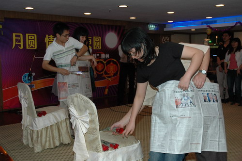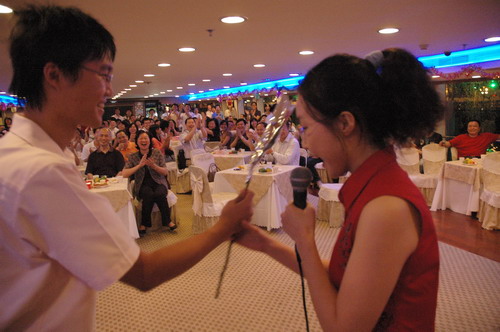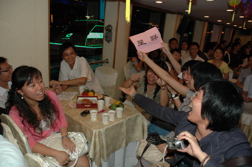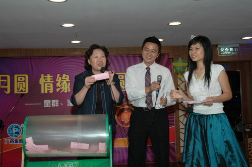 為加強兩家企業(yè)新員工間的交流,晚會還特意穿插了《真情傳遞》、《擁擠的公交車》等游戲,與觀眾互動。星群與潘高壽的員工們不分彼此,在“擁擠的公交車”中傳遞著歡樂,更傳遞著真情。臺上、臺下歡聲笑語,船內(nèi)和諧一片。此外,還有讓人驚喜萬分的幸運大抽獎。精彩處當(dāng)數(shù)由呂部長抽的一等獎,由于第一次抽出的獲獎?wù)卟恢ハ?,又進行了第二次抽獎,最后由星群藥業(yè)的黃碧蓮戲劇性地中獎,獲得了電磁爐一臺。