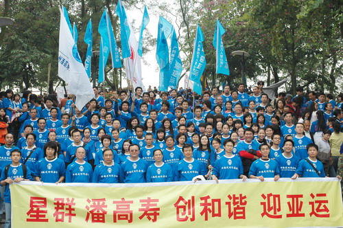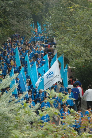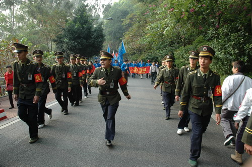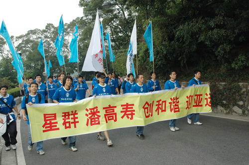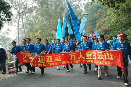 冬日陽光明媚,照在人們的身上,更顯精神抖擻,面貌一新。8時30分,由廣藥集團、發展集團眾領導引領的隊伍率先向山頂公園進發。一路振臂高呼,一路引吭高歌。潘高壽的隊伍打著“星群潘高壽、創和諧迎亞運”的橫幅也分外醒目。員工們穿著整齊的藍色短袖,步履輕盈。隊伍中有十幾二十歲的青壯年,更多的卻是中老年職工,但爬起山來她們卻絲毫不遜色。開心爽朗的笑聲不絕于耳,穿繞著碧綠蔥蔥的白云山。登山隊伍走在蜿蜒的山路上宛如一條色彩繽紛、連綿不絕的長龍,預示著廣藥集團的迅速發展和全面騰飛。登頂后,大家興高采烈,紛紛照相留念,留下健康的笑臉,更展現了和諧、進取、奮發向上的風貌和勇攀高峰的堅定信心……