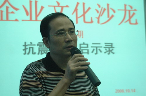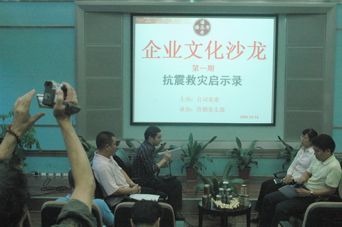 本次沙龍由公司黨委主辦營銷黨支部承辦,營銷黨支部的黎少漢主持,以“抗震救災與社會責任”為主題。整場活動就“學習貫徹胡錦濤同志在抗震救災先進基層黨組織和優秀共產黨員代表座談會上重要講話精神”和“抗震救災與企業社會責任”兩大問題進行了深入淺出的探討,各議題的提出與討論引發了全場參與者的熱烈共鳴。活動邀請了營銷黨支部的陳偉強、張云波、黎月雯、何穗智、職能二支部的李雪文和生產一支部的沈宗年作為本場嘉賓與參與者共同探討。