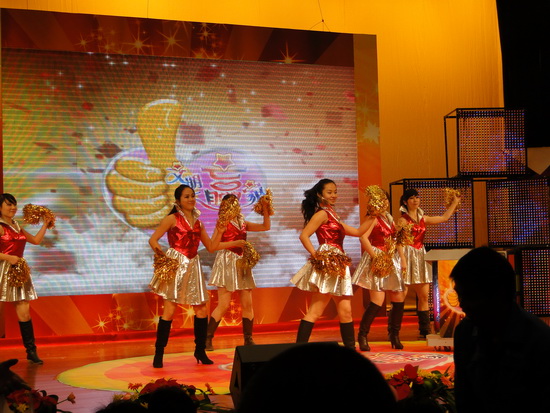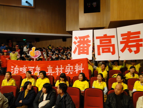 在主持人鵬sir的帶動下,觀眾時而揮動手中道具,時而掀起人浪,場面十分熱鬧,歡笑聲不斷。身穿鮮黃色上衣的潘高壽員工顯得格外搶眼,“潘高壽”三個醒目的大招牌更是搶盡了風頭。