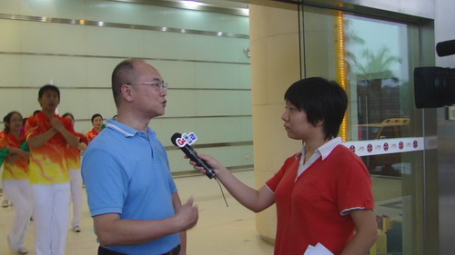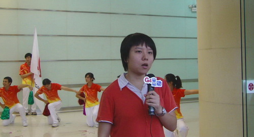 領操戎全剛向記者介紹助威操排練情況