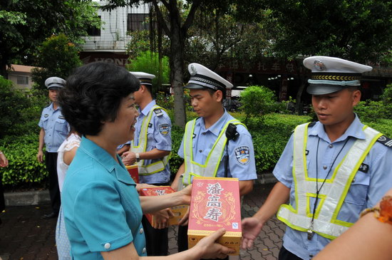 潘高壽鄭楠黨委書記、市橋街道辦事處金主任一行來到市橋交警大隊第一中隊所轄下馬路上,向執勤的交警、交通協管員送上解暑涼茶,向為暢通城市交通而辛勤工作的交警們表達敬意。又來到八月廣場,向幸福廣州城市志愿服務站的志愿者們送上涼茶。同時,傾聽志愿者們服務社群的新鮮事,為他們無私的奉獻精神所感動,也為他們鼓勵打氣,齊勉力,為廣州創建文明城市揮灑汗水。