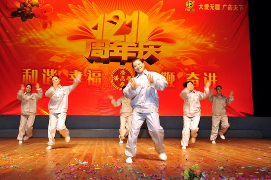 當然,潘高壽的發展離不開潘高壽人的艱辛努力。會上,魏總宣讀了2011年“雙達標”勞動競賽表彰先進(先進集體、五好達標班組、潘高壽之星、三十年工齡員工)的決定。各獲獎集體和個人激動陳詞表達對企業的感恩之情。接著,大家以勁歌熱舞來慶賀企業生日。演出的《永遠跟黨走》、《相親相愛一家人》、《咱們工人有力量》等十多個節目全為員工們自編、自導、自演。其中大型時裝音樂劇《和諧企業》逾70人參演,公司班子成員到一線生產員工齊齊參與。節目展現了潘高壽人熱愛生活與工作、銳意進取的精神風貌;彰顯的是潘高壽人在廣藥集團“大南藥”、“大健康”產業、“136”戰略的指導下,發揮智慧與力量,續寫潘高壽的百年輝煌!