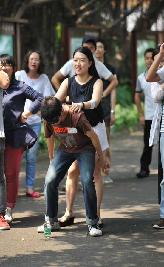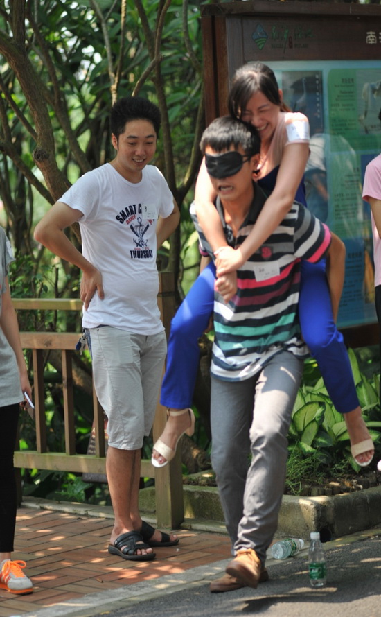 交友活動以神秘緊張的隨機“選”搭檔開始。男女青年們分別隨機抽取搭檔的編號,“選擇”要和自己共度一天的“另一半”,TA可能是你朝夕相處的同事,也可能是你從未謀面的新同事,令人期待又緊張。接下來大家和“新伙伴”共同完成了“360度全認識”和“你是我的眼”等游戲。看,游戲中默契稍遜的一隊小伙伴就要面對“有愛”的懲罰——“十指緊扣”、“明送秋波”?!坝袗鄣膽土P”掀起了活動一輪又一輪的高潮,現場響起陣陣歡樂的笑聲。壓軸游戲“你是我的眼”難度升級,男生要蒙著眼背著女生,在女生的指揮下跨過重重障礙,不小心撞到障礙物的小伙們就要接受“有愛的懲罰”!