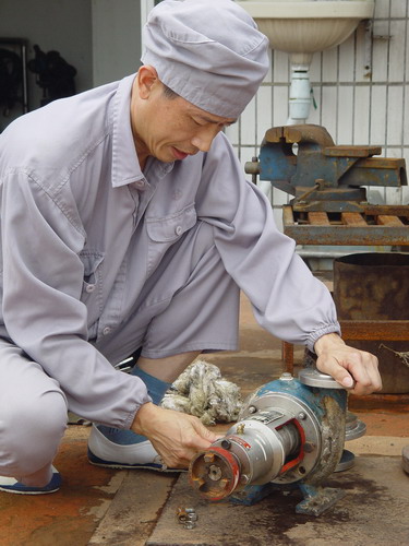 一而再,再而三,從采訪劉永翔、潘衡及他,都是資深的技術(shù)骨干,都不擅“推介”自我,這顏建尤甚。真難與他在球場(chǎng)上那步伐靈巧,扣殺兇猛的身影相聯(lián)。他是“羽壇”高手,在“05年潘高壽運(yùn)動(dòng)會(huì)”上拿了羽毛球男子冠軍。咦,我們靈機(jī)一動(dòng),就從強(qiáng)身健體打開(kāi)話匣子。果然有料到。他說(shuō)堅(jiān)持運(yùn)動(dòng)健身(每周二次,加班除外)實(shí)在好。一是以前多病,堅(jiān)持鍛煉后,小病不治而愈。二是工作起來(lái)更帶勁了。硬朗的體魄使他面對(duì)生產(chǎn)故障的特發(fā)事件時(shí),總能沖鋒陷陣,來(lái)之能戰(zhàn),戰(zhàn)之能勝。不料健身話題完了,他又“故態(tài)復(fù)萌”,一句“還是寫(xiě)寫(xiě)別人吧”就想溜掉。在制劑大樓六樓半敞開(kāi)式的保全組里熱風(fēng)拂面,真難熬,可他們習(xí)慣了。可一進(jìn)入工作狀態(tài),他們就自如得很,會(huì)讓人聯(lián)想到“咱們工人有力量”那首名歌。恰巧那時(shí)有一臺(tái)壓濾泵送來(lái)修理。只見(jiàn)他十分利落,架勢(shì)了得,蹲身彎腿,左壓右拔,套路嫻熟,猶如“球逢敵手”,已手到擒來(lái)(見(jiàn)題圖)。工作大于天,不便打擾他。我們心有不甘,只好迂回,來(lái)個(gè)上下求索——逮住剛修機(jī)回來(lái)的他的下屬曾建明,來(lái)個(gè)“隔離”提問(wèn)。隨后找他的上級(jí)葉耀成高級(jí)經(jīng)理了解他的情況。