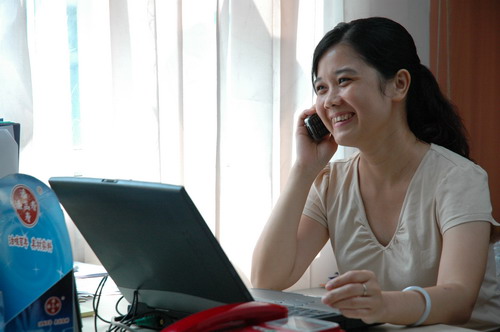 在解放中路618號五樓的產品營銷中心,在她工作的空隙中我們聊了起來。“對不起,其實啊,我沒有什么好說的。”“當是朋友敘舊吧。近來忙啥?”我們直問。“渠道的維護,特別是終端跟進。”她笑著說。“我建議存廠直撥給貨,有沒有問題呢?”電話老來,她又“上線了”(如圖)。“我建議……有沒有問題呢?…..再商量吧”她三句式的口頭禪,據說還挺管用。她善目明眸、語氣委婉,總是笑瞇瞇的,自有一種親和的“殺傷力”。我們走訪了熟悉她的人,都有這樣的感覺。